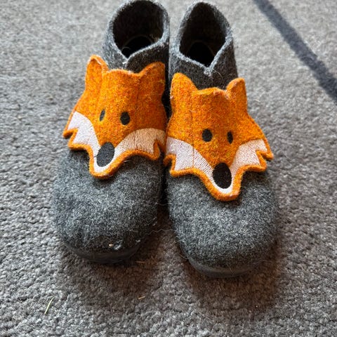 Superfit barnets tøfler i størrelse 21, unisex. Tøflene er grå og laget av filtmateriale med en dekorativ revemotiv på forsiden. Sålene er svarte og har mønster for bedre grep. Egnet for innendørs bruk.