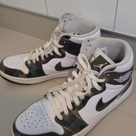 Selger et unikt par Air Jordan 1 Mid sneakers som har blitt custom-malt med et vakkert, detaljert blomstermotiv på utsiden.