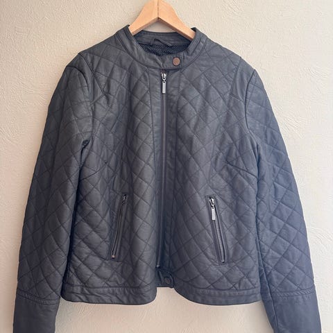 Mango Major Jacket damejakke i størrelse L. Jakken er grå og laget av 100% polyester. Den har quiltet mønster og glidelåslukking foran. Jakken har to sidelommer med glidelås og et dekorativt emblem på ermet. Den er designet for kvinner og passer til ulike hverdagslige anledninger.