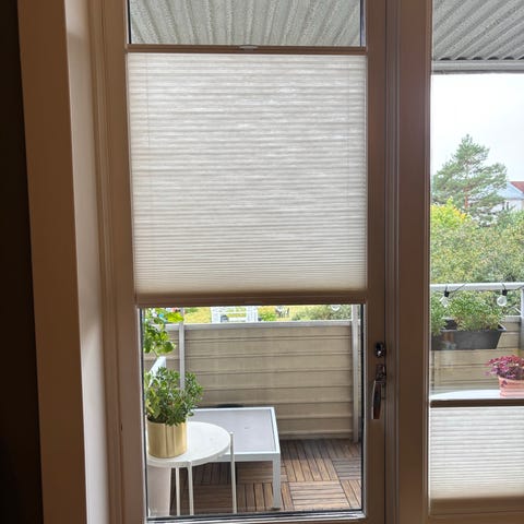 Plissegardin Vema Duette opp/ned med dobbelt stoff. Kjøpt og montert av Kjells Markiser for 3 år siden. Selges pga de ikke passer i mine nye vinduer.