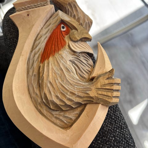 Håndlaget Hane i tre. Hanen er 16 cm høy.