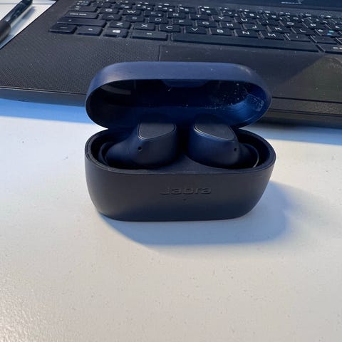 Jabra True Wireless ørepropper i mørkeblå farge. Kommer med ladeetui og USB-C ladeport. Designet for trådløs bruk og bærbarhet.