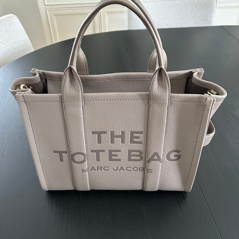 «The Tote Mini» shopper-veske i farge cream fra Marc Jacobs. Den er laget i skinn og har glidelåslukking. På forsiden finnes en preget logo, og vesken har både en baklomme, avtakbar og justerbar skulderrem, to avrundede hanker samt sølvfargede metalldetaljer.