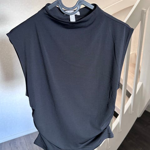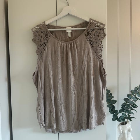 H&M Andre topper for kvinner i størrelse M. Toppen er beige og har en strukturert overflate. Den har en løs passform med snøring ved halsen og uten ermer.
