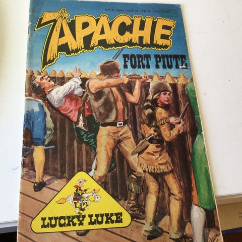 Samling av tegneseriehefter fra Apache og Tomahawk med western-tema. Inkluderer titler som Fort Piute, Skalpjegerne, Ondskapens by, Kaptein Apache og flere. Heftene inneholder historier med karakterer som Lucky Luke, Sam Bass og Kaptein Apache. Serien har varierende antall sider og illustrasjoner i farger. Passer for samlere og lesere interessert i klassiske western-tegneserier.