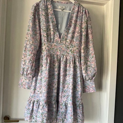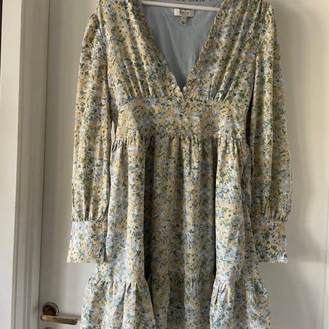 Floyd festkjole i størrelse XS, hvit farge med blå blomsterprint. Kjolen har lange ermer og en elastisk midje. Laget for kvinner.