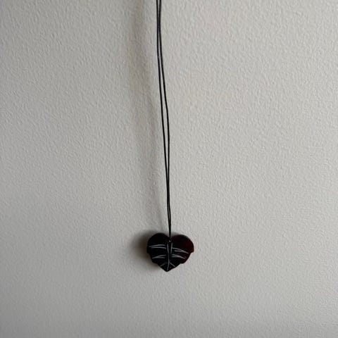 Håndlaget rødt hjerte halskjede laget av andre materialer. Halskjedet har en svart snor som kan justeres i lengde. Hjertet er solid og har en liten dekorativ detalj i en kontrastfarge. Passer som et tilbehør for både hverdagsbruk og spesielle anledninger.