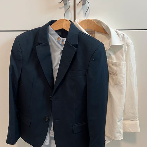 Grå dressjakke og bukse, hvit skjorte og slips+ pen sko