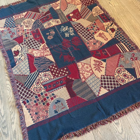 Unikt vintage stort sengeteppe til dobbeltseng med 2 pynteputer i Patchwork selges for kr 3500. Ble kjøpt i USA på 80-tallet. Pent brukt, har stort sett ligget i et skap, ikke vært fremme de siste 25 års. Liten delvis usynlig feil på ene pynteputa som kan sys med noen få sting, se bilde. Størrelsen er 240x220 cm. PyntePutene er i str. 76x60 cm inklusive kanten og passer til ordinær hodepute. 100% polyester fiber og stoff i 100 % bomull, se bilde med info på lapp. Nydelig mønster og farger, offwhite, blånyanser og noe grønt og litt rosa (se bilder).
