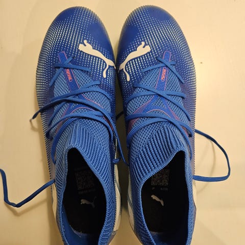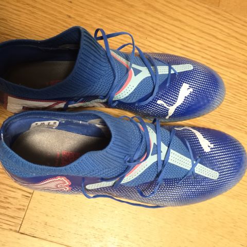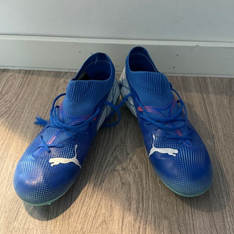 Pent brukt blå Puma Future 7 Match FG/AG fotballsko i størrelse 38,5 . Brukt i vinterhalvåret av en som foretrekker fotball om sommeren, så brukt maks 20 ganger. Nyvasket, og skoen ser knapt brukt ut, men noen flekker gikk ikke bort i vask