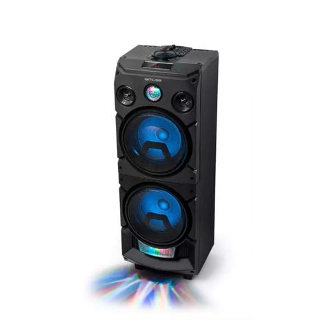Den har Bluetooth, CD, USB og radio, samt lys som følger musikken. Enkel å bruke og lett å flytte rundt.