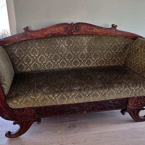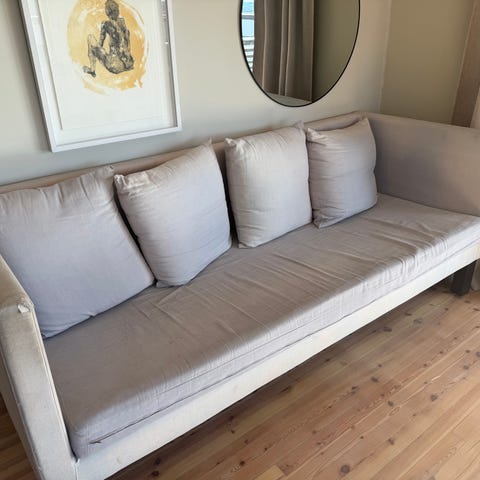 Superfin med oljet eikeben. Ved å kutte benene kan den brukes som en vanlig sofa. Den er helt som ny! Trekkene er supergreie og vaske! Må hentes .