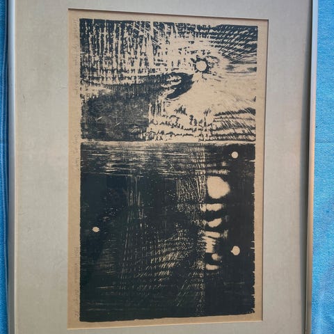 Stort tresnitt av den etablerte grafikeren Mari Krokann Berge. Svart-hvitt, klassisk. Uten tittel, kjøpt av Kunstnerforbundet 1988. Opprørt hav?