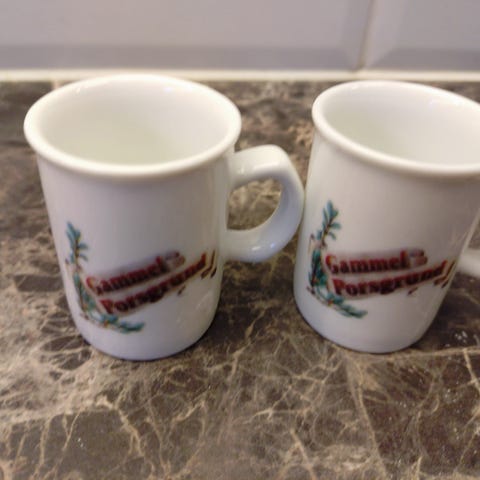 Flott krus fra Porsgrund porselen med reklame for Peugot. Diameter 7cm og høyde 10cm. Pent brukt.