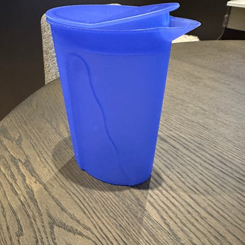 Stor, retro mugge fra Tupperware. Rommer 1,9 l. Den har misfarging på kanten øverst, på lokket og på håndtaket (se bilder). Ellers hel og pen. Høyde: 18,5 cm.