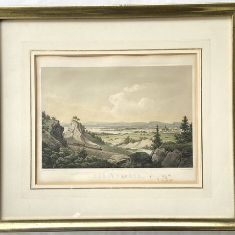 Signert landskapsmaleri utført i olje på lerret. Maleriet viser et naturskjønt motiv med fjell, trær og en bygning i forgrunnen. Innrammet i en enkel, treramme.