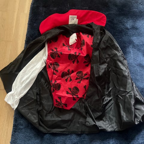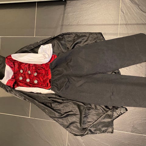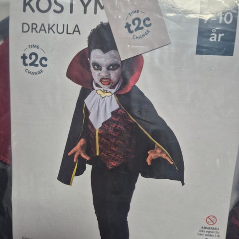 Vampyrkostyme til barn størrelse 6-7 år selges. Fullt antrekk med skjorte, bukse og kappe med stiv kant som står litt opp.