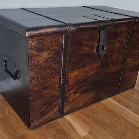 To små trekister med metallbeslag. Størrelsen er 19x20x35. Mange muligheter til bruk. Litt støvete på bildet, men de er litt ulike i fargen.