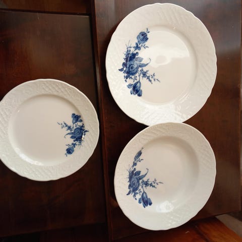 Nydelig servise i hvitt med blått motiv. Har en dyp tallerken, en frokost tallerken og en middagstallerken.