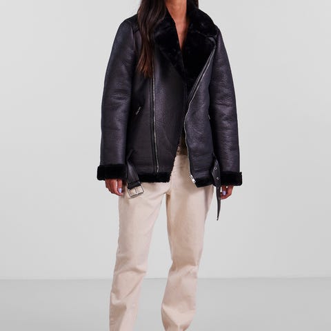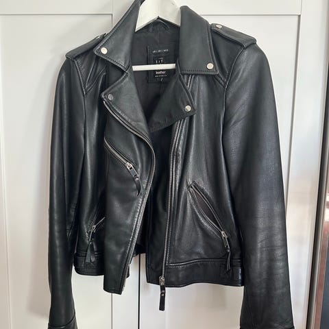 Zara jakker i svart farge, størrelse L .Jakken er laget av materiale som etterligner skinn, med glidelåser og belte i livet.