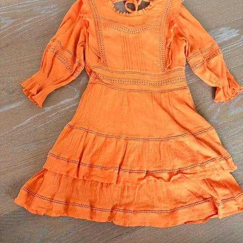 Kjolen har smale skulderstropper med rysjedetaljer og en elastisk ryggdel for tilpasset passform. Designet med en lett og luftig struktur, egnet for varme dager.