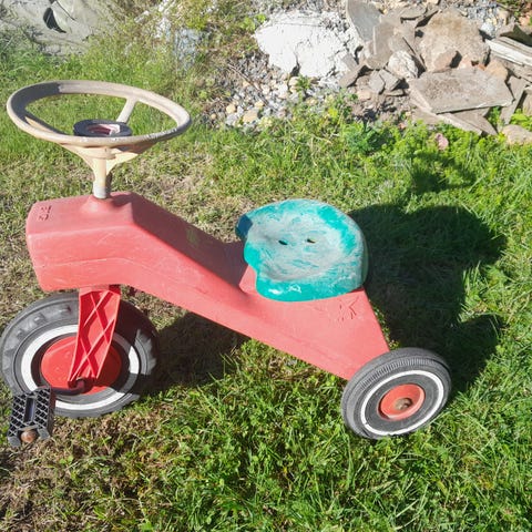 Flott traktor med henger som fjernstyres med ledning fra 90-tallet. Er i veldig fin stand selve traktoren og hengeren, men kontrollen mangler lokk hvor batteriene er og det er noe rust på innsiden hvor batteriene skal være.