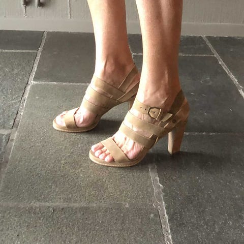 Hæler i størrelse 38, laget av brun skinn og stoff. Skoene har åpen tå og flere remmer med spenner foran. Hælene er høye og har en konisk form. Egnet for damebruk, bruksmerker på hælene.