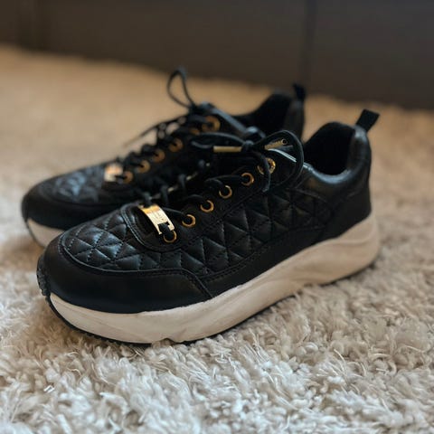 Hvite sneakers i premium ekte skinnmaterialer fra Stockholm Design Group. Logo i gull på siden og bak på hælen. Modellen har en komfortabel plattformsåle som måler ca 2,5 cm foran og 4 cm bak.