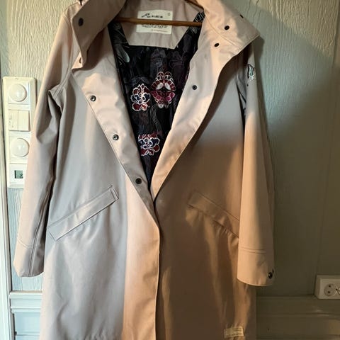 Odd Molly regntøy i størrelse L for damer. Jakken er rosa med hette og har snøring i midjen for justering. Den er laget av vanntett materiale og har trykknapper på ermene. Innsiden av jakken har et mønstret fôr. Har også støvler til salgs i samme serie str 41 om det skulle være av interesse og passe.