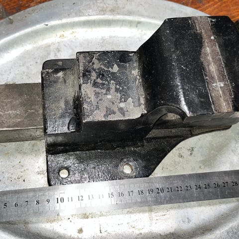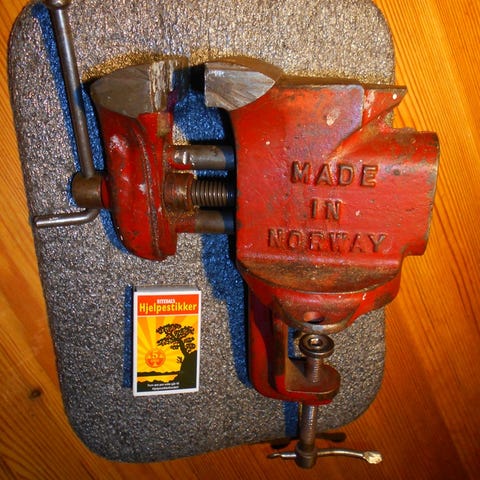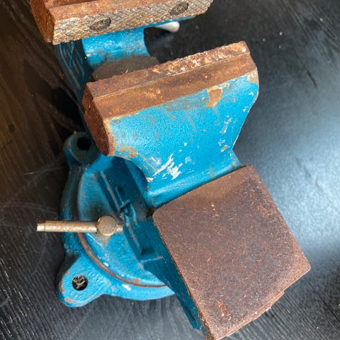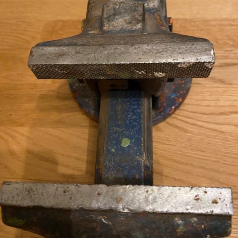 Metallskruestikke med blå lakk. Skruestikken er egnet for feste og arbeid på mindre arbeidsstykker og kan monteres på arbeidsbenk.