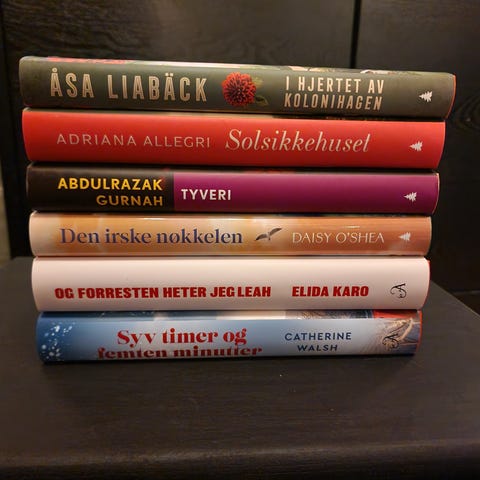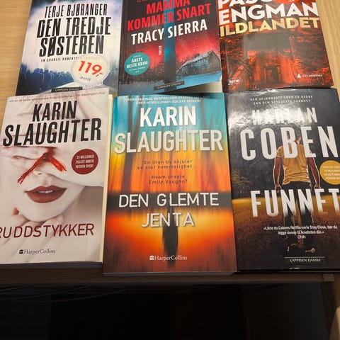 Pakke med fem bøker: 'Ildbarnet' av S. K. Tremayne, 'Elskede barn' av Rony Hausmann, 'Svigermoren' av Sally Hepwort, 'Skyggespillet' av Anna Bågstam, og 'Myrkongens datter' av Karen Dionne. Bøkene er brukt og viser normal slitasje på sidene og omslag.