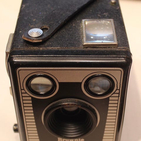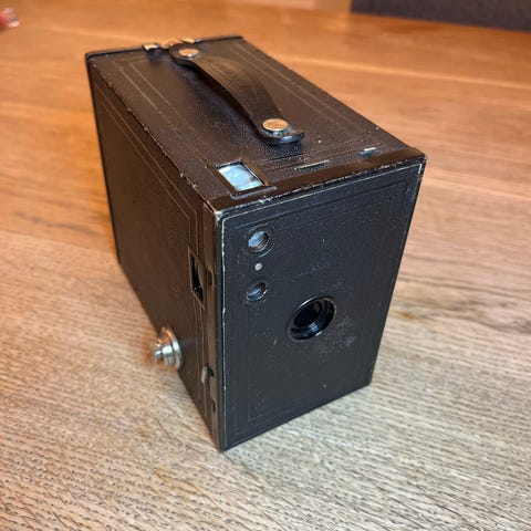 Nerlien, J.L. Nerlien Oslo, Kodak boxkamera, Six-20 Brownie, art deco kamera, vintage foto, norsk forhandler, retro, fotohistorie, samlerkamera, dekor