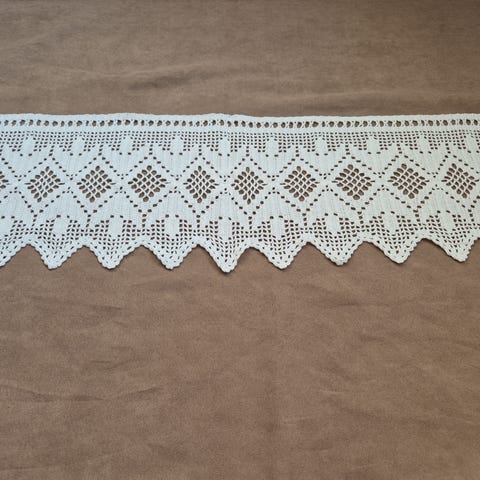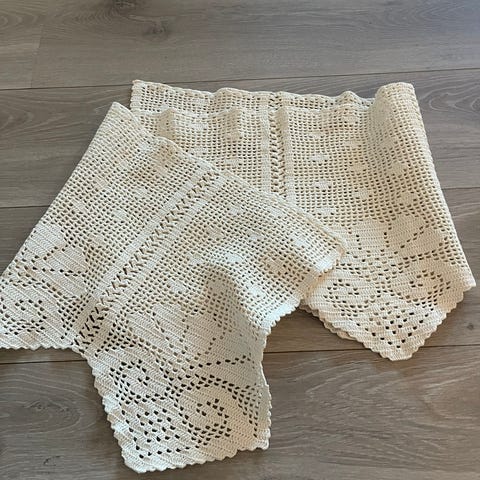 Lekre gardinkapper, maskinheklet. En lengde på 270x28 cm. Kr 200,-. Og en lengde på ca 1,60 x28 cm. Kr 150. På baksiden av begge kappene er det sydd på et ekstra stykke stoff til løpegang for gardinstang.
