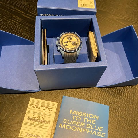 Ubrukt MoonSwatch Mission To Jupiter selges. Den ble kjøpt i Zürich i januar 2024, men har aldri vært brukt og ligger pent og pyntelig i originalesken sin. Plastikklappene er forsatt på klokken for å beskytte den. Stemplet garantikort og kjøpskvittering medfølger selvsagt. Klokken har ligget ubrukt ett år fordi jeg har andre klokker som jeg bruker. Det er trist at den bare ligger der og den bør derfor finne seg en ny eier som kan sette pris på den og bruke den.
