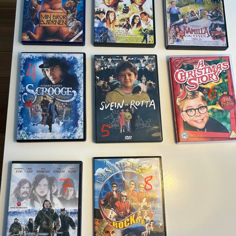 Samling av DVD-filmer med ulike titler og sjangere. Inkluderer filmer som 'Despicable Me', 'All G', og flere. DVD-ene er i standard størrelse og format, egnet for avspilling på kompatible DVD-spillere. Kan være riper