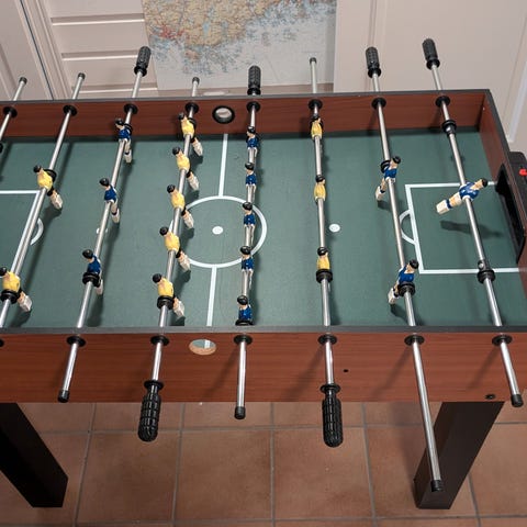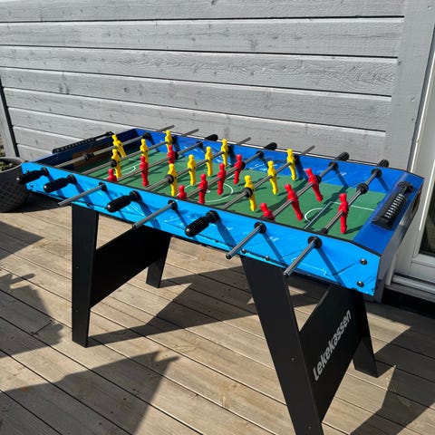 Garlando Champion League fotballspillbord i blått design med trykk langs sider og ben. Bordet har flere spillere montert på stenger på hver side og mål i hver ende. Egnet for innendørs bruk til bordfotballspill for flere personer samtidig. Passer til bruk i hjem, fritidsrom eller fellesarealer der man ønsker et bordfotballspill.