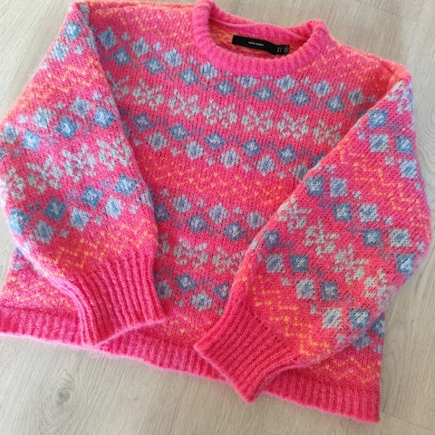 Myk og deilig strikkagenser fra Vero Moda. Kjempefin farge nå til høsten og varmer også godt. Den har et lite hull på oversiden av høyre arm, men det synes svært lite når man har den på. Litt nuppete noen steder men det skal være mulig å få vekk.