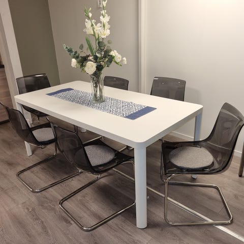 - Stand: Jeg har alltid brukt bordduk, så bordflaten har nesten ingen skrammer. Stilige linjer som passer til moderne hjem..
