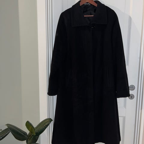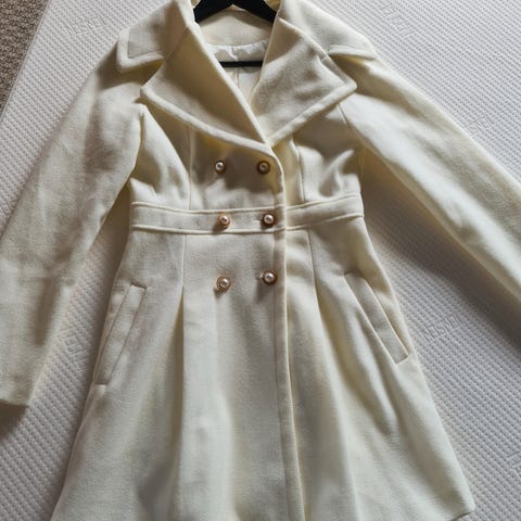Selger en vakker ubrukt hvit frakk / kåpe med vattert quiltet innerfor. Kåpen har et elegant innsvinget snitt og klassiske brune tortoise shell knapper. Knappene er kun til pynt da kåpen ikke kan kneppes, så den er designet til å være åpen over selskapskjoler eller andre pene antrekk når man ikke skal være ute lenge på kalde høst - og vinterdager. Perfekt når man f.eks skal i juleselskap. Størrelse Small. Jeg er 164cm høy og den rekker meg til midt på leggen.. Den har ligget nedpakket derfor er den litt skrukkete på bildene. Selges kr 150,- pluss frakt. Kan også hentes i Skien.