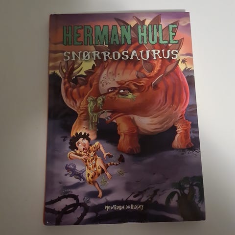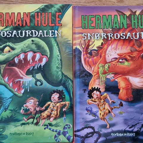 Herman Hule barnebøker med titlene Snørosauren og Dinosaurdalen. Passer for barn, inneholder illustrasjoner og fortellinger om dinosaurer og eventyr.