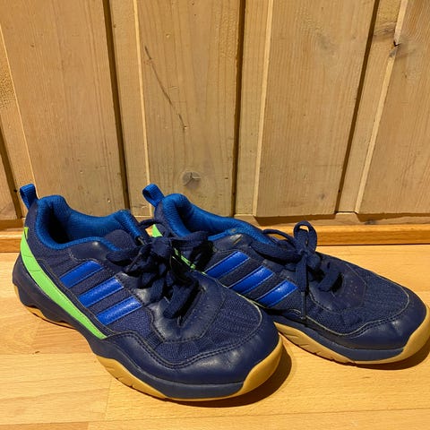 Tøffe innesko til gymtimer og ballidrett. Skoene har motsatte detaljer i rødt og blått. Str 35. Passer både gutt og jente. Merke Mizuno