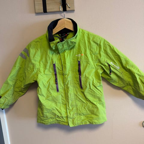 Didriksons 1913 barnejakke i størrelse 120 unisex. Vil påstå den passer for barn i str 128. Jakken har grønn og hvit fargekombinasjon, med hette og glidelås foran. Materialet er designet for å gi beskyttelse mot vær, egnet for barn i denne størrelsen.