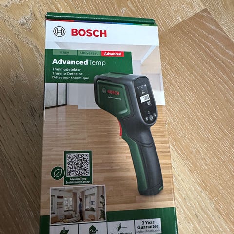 Bosch PTD 1 termometer med digital skjerm. Enheten har flere funksjoner for måling av temperatur og fuktighet, med tydelig bakgrunnsbelyst display. Kommer med etui for oppbevaring og beskyttelse.
