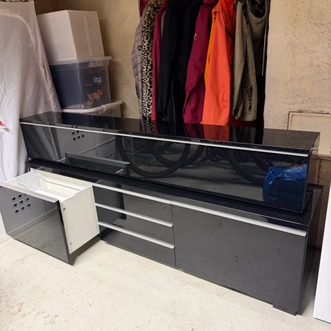 Tv-benk med innbygg skjøteledning. Grå/hvit