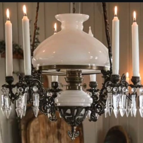 Elektrisk lampe som ser ut som en parafinlampe. Veldig tynt glass. Kan være en fordel med ny leding da den er av gammel type