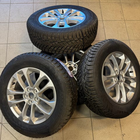 Piggdekk på felg selges. Dekkene er gamle og bør byttes (tatt i bruk i 2016). Ca 3-4 mm mønsterdybde og de fleste piggene er knekt. Hjulene har dekktrykksensor, minst en av dem virker ikke (utbrukte batteri). Felgene er stort sett hele og fine bortsett fra noen småhakk og småkorrosjon her og der, se bilder.