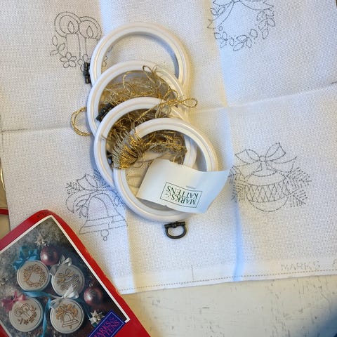 Broderier med soppmotiv med rammer i hvitt, gull og blått.