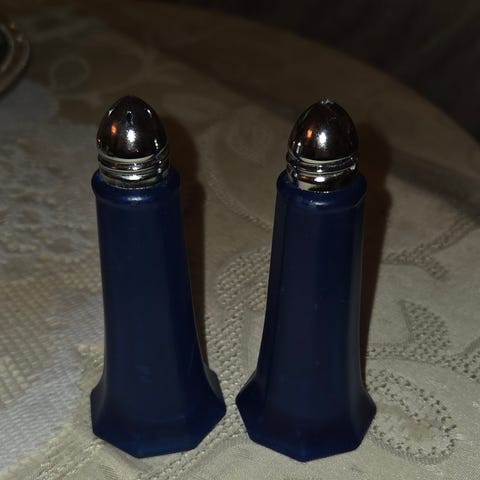 Salt- og pepperbøsse, mann og kone i hvitt porselen med blå og svart dekor, kjent som Delft Blue stil. Håndmalte fra Nederland. Selges samlet. H 7,5 cm.