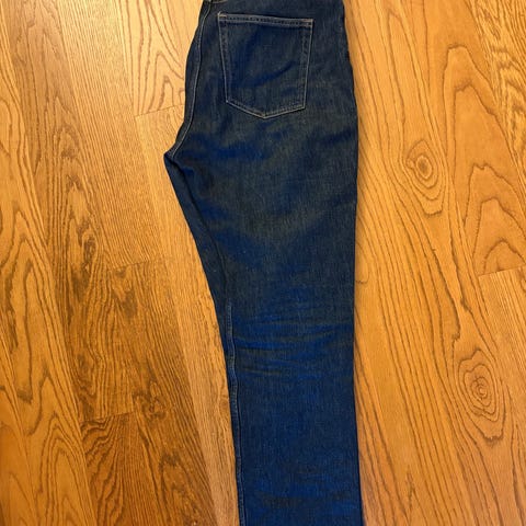 & Other Stories Mørkeblå jeans for kvinner i størrelse L med midjevidde W40. Jeansene har en mørk blå farge og er laget av denimmateriale. De har klassisk femlommersdesign og synlige sømmer. Passer til hverdagsbruk og ulike anledninger.