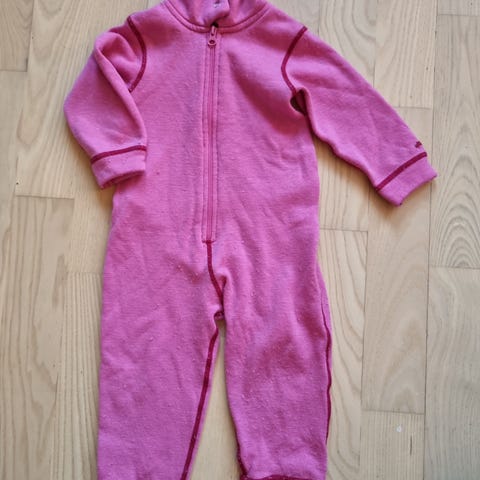 Fint brukt ull heldrakt med glidelås. Fin sterk rosafarge. Noe bruksmerker nede på beina, noen små malingsflekker. Ellers lite slitasje og uten hull. Str 2 år, Tom og Trine.